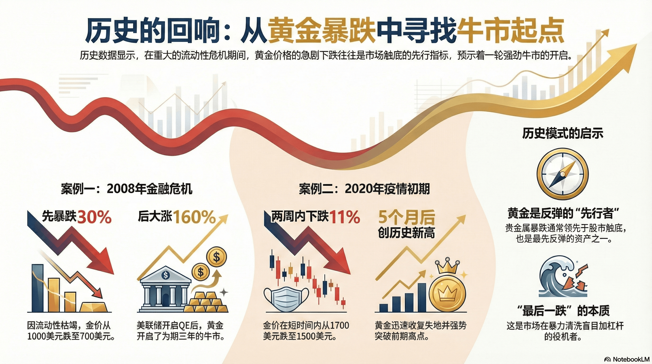 - 2020 年疫情初期:黄金在两周内暴跌 11%(从 1700 跌至 1500),随后仅用 5 个月时间就创下了当时的历史新高。