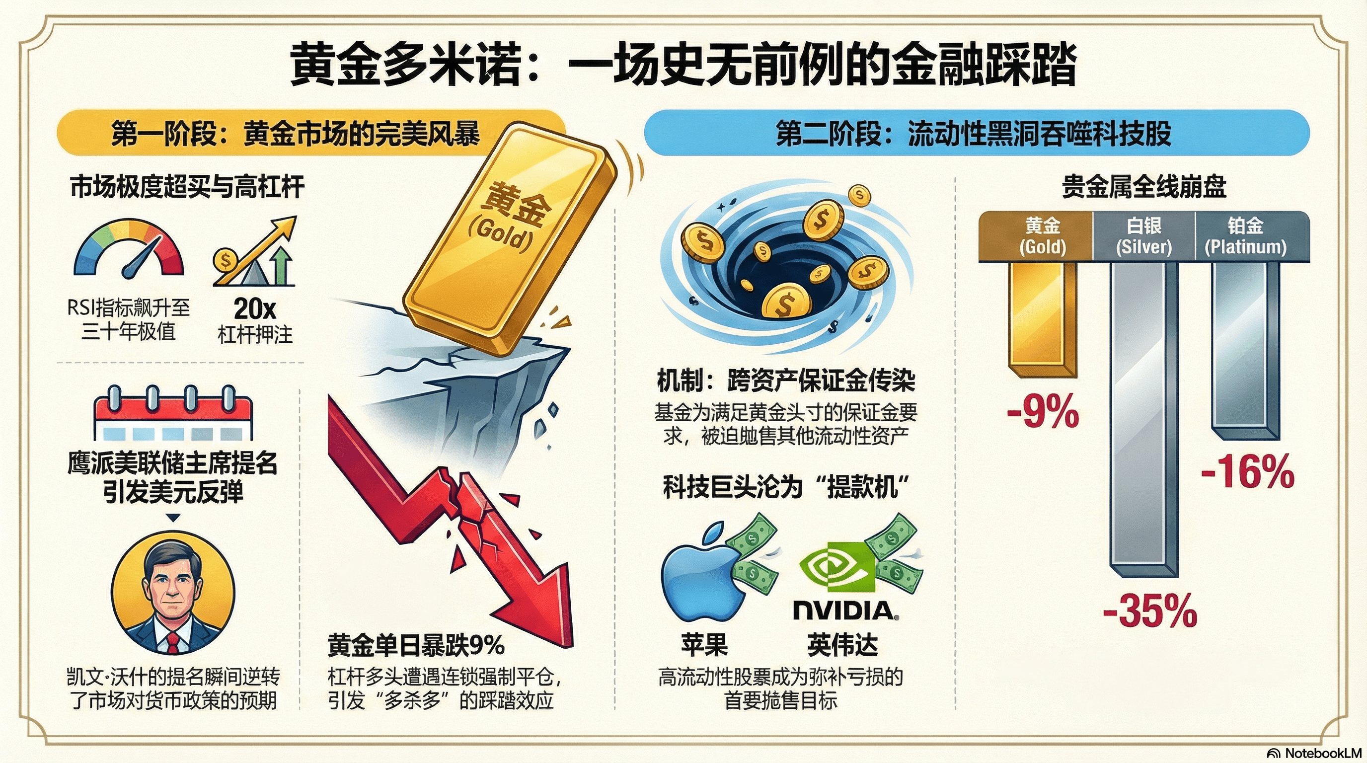 划重点 ① 贵金属 1 月底的暴跌并非基本面的溃败,而是高杠杆多头的集体谢幕。2026 年初,过度超买的黄金在凯文·沃什入主联储的预期下闪崩,演变为吞噬一切的流动性黑洞。为弥补黄金头寸的巨额亏损,对冲基金被迫抛售流动性极佳的科技巨头,导致纳斯达克陪葬。